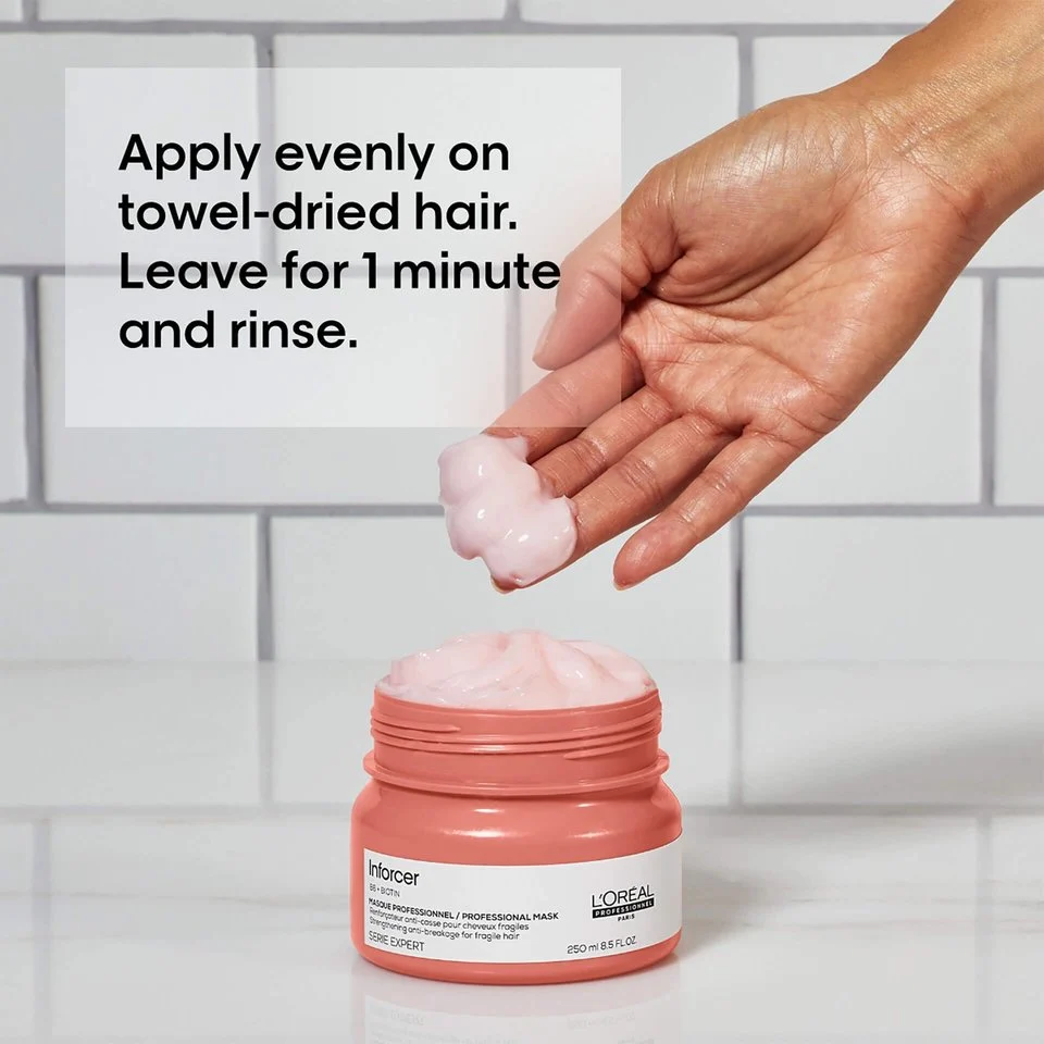 پس از شستشوی مو ها با شامپو L'Oréal Professionnel Inforcer، مو ها را با حوله خشک کنید تا کمی از رطوبت آنها گرفته شود. مقدار مناسبی از ماسک را برداشته و بهطور یکنواخت از نیمه مو تا نوک آن پخش کنید. موها را به آرامی ماساژ دهید تا ماسک به خوبی در تار های مو نفوذ کند. اجازه دهید ماسک 5 تا 10 دقیقه روی مو ها بماند تا ترکیبات فعال آن به عمق فیبر مو نفوذ کرده و عمل کنند. سپس با آب ولرم به خوبی شستشو دهید. برای دستیابی به نتایج بهتر، از این ماسک 1 تا 2 بار در هفته استفاده کنید.