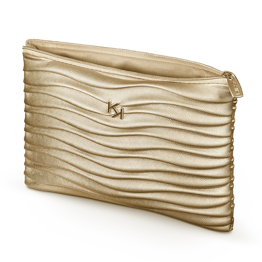 • یک کیف طلایی لوکس و زیبا با طراحی موجدار برای حمل آسان محصولات آرایشی