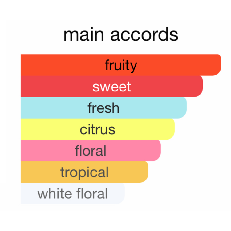 عطری پر از طراوت، حس رهایی، با ترکیبی شاد از میوههای تازه و گلهای لطیف؛ زنانه، مدرن، و همیشه بهروز.