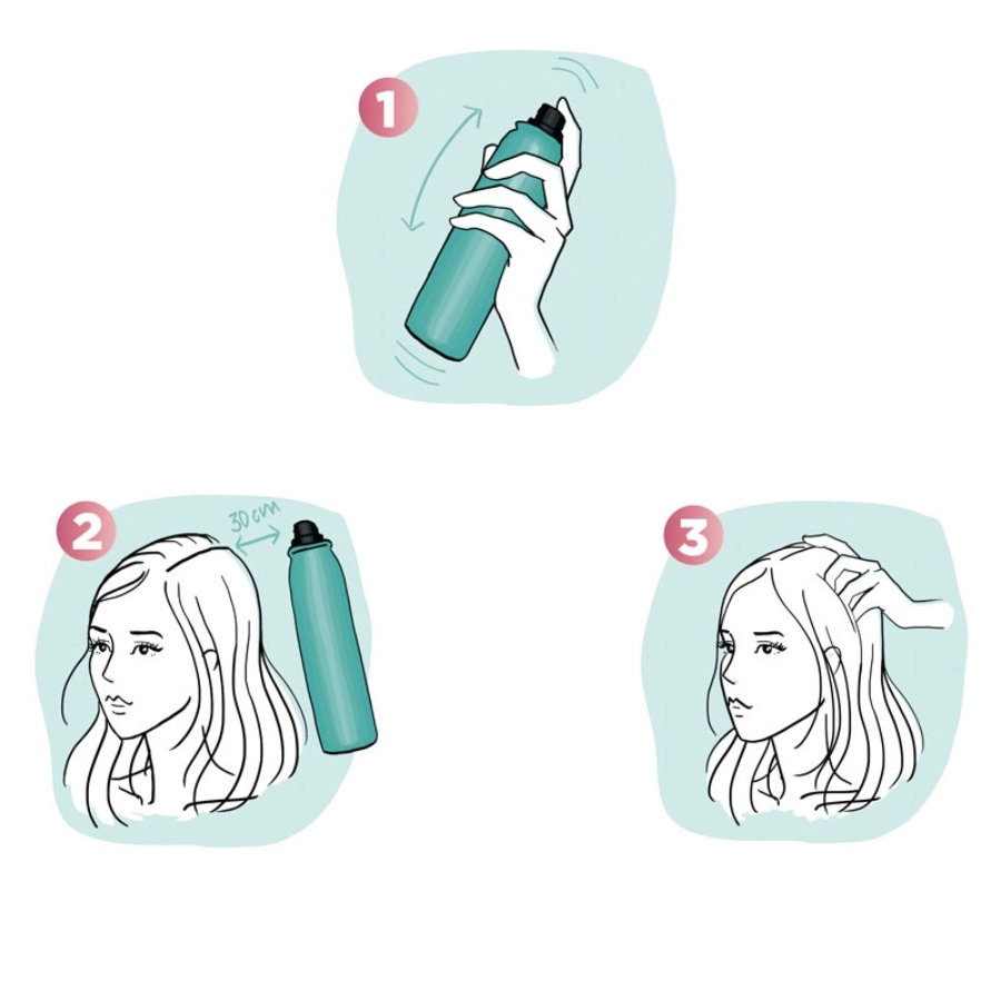 از فاصله حدود ۳۰ سانتیمتری، شامپو را روی ریشه مو اسپری کنید.